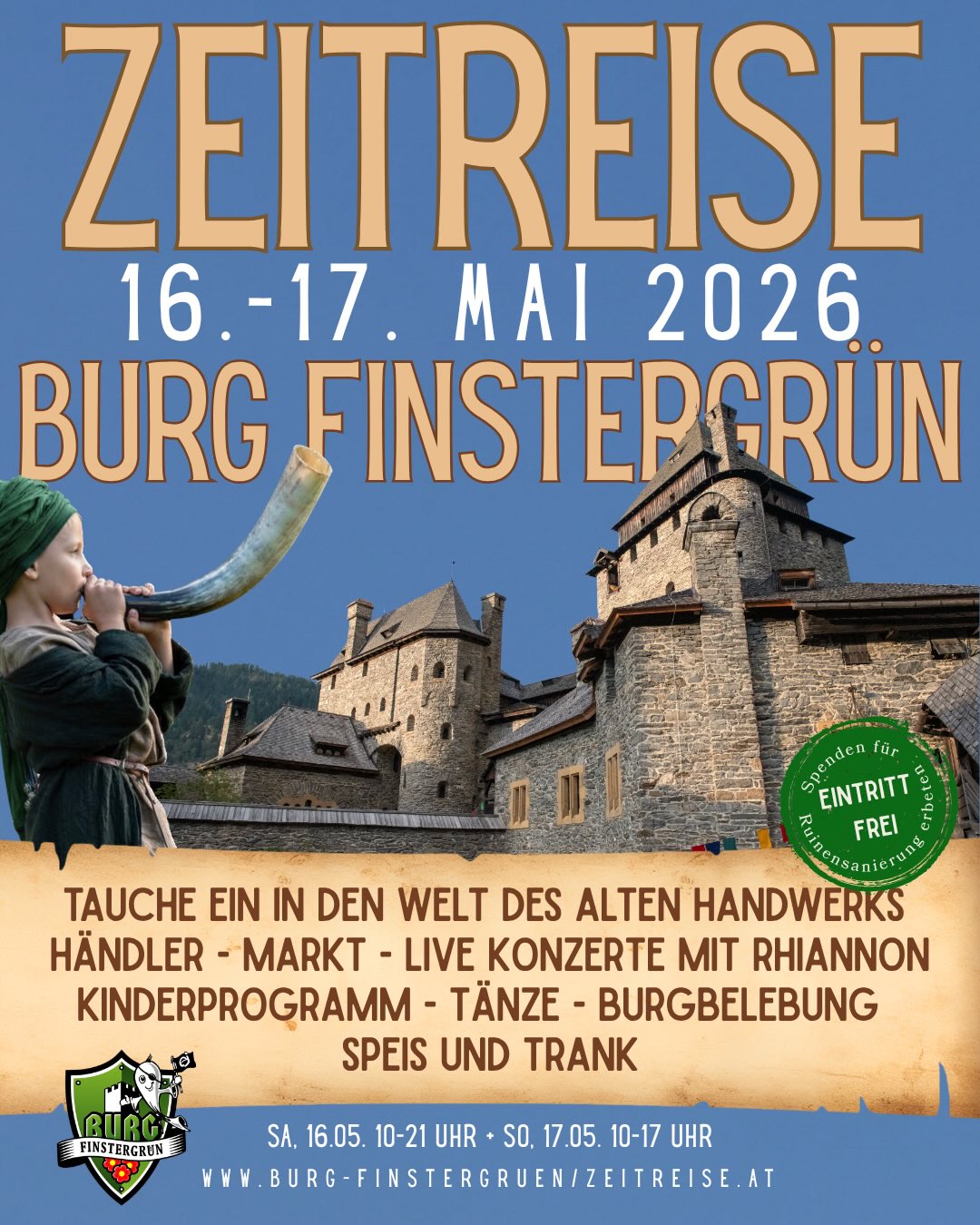 Vom 14.-17.5.26 gibt es ein ganz besonderes Wochenende: verschiedene Handwerke zum Ausprobieren, Kinderprogramm, Bogenschießen, Teppichwettflug, Musik, Tanz & Feuershow. Zimmerbuchungen im Burgbüro